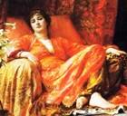 Woman dressed in luxurious red, lying on a silken couch