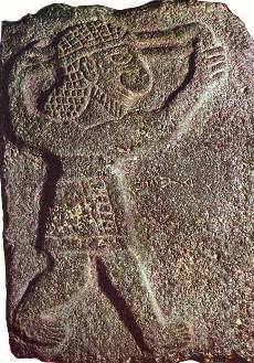 Ancient stone carving of a soldier wielding a slingshot; it was a common weapon in ancient Israel