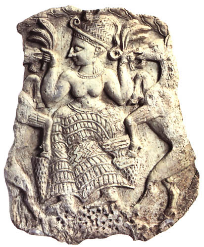 Ancient carving of a fertility goddess with goats