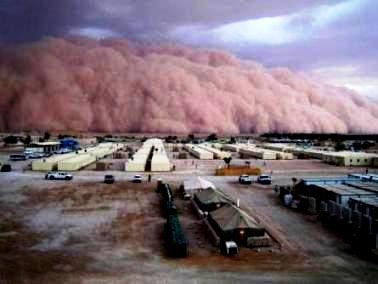 A dust storm rolls in from the desert, completely obliterating the land and sky and making it difficult to breath