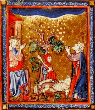 Medieval manuscript showing the damage to foliage and livestock caused by heavy hail
