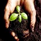 Hand holding green shoot and earth