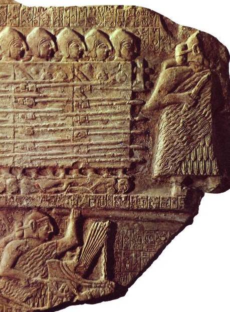 Eannatum, King of Lagash, leads charging troops; he holds a long spear in his left hand and
