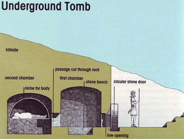 Cross-section of an underground tomb at the time of Jesus: guarded entrance with stone door; first chamber cut into the rock; second inner chamber with niche holding a body bound in linen cloth