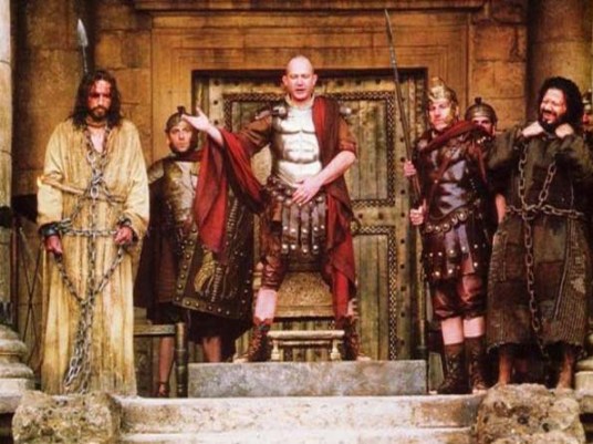 Pilate presents Jesus to the crowd, with Barabbas at right; still from the movie ‘Passion of the Christ’