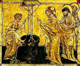 Exquisite gold mosaic, German, 1420, showing the Samaritan in a practical but not very modest position for drawing water