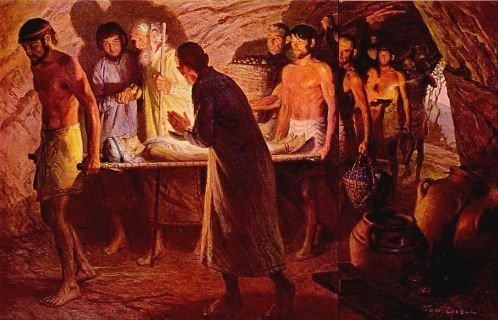 The Burial of Sarah, painting showing bier and interior of tomb